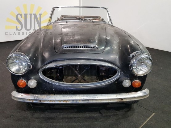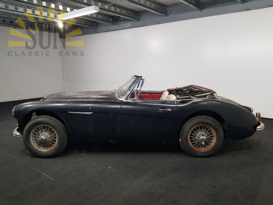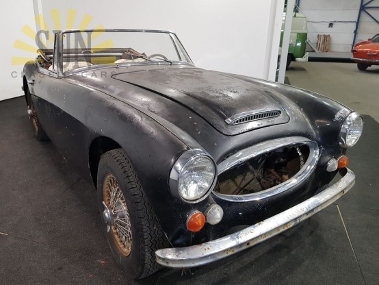 Super solider Austin-Healey 3000MK3. Sehr gute Basis für die Restaurierung, so solide werden Sie nicht stoßen. Der Motor des Austin-Healey läuft nicht, kann aber von Hand gedreht werden. Das Auto wurde ursprünglich in der beliebten Farbkombination schwarzer Farbe mit roter Innenausstattung geliefert. Das Auto hat einen amerikanischen Titel.